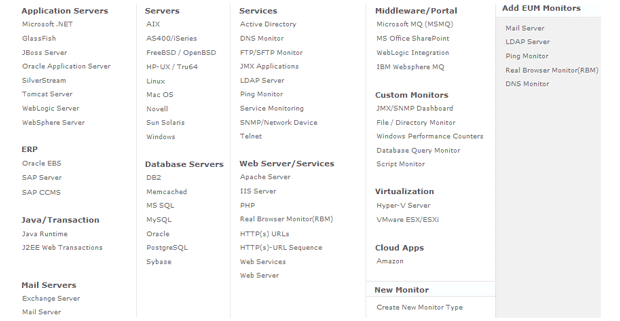 server monitoring, application server monitoring, database monitoring, web services monitoring, virtualization monitoring, cloud monitoring and an array of other application management capability that will help IT administrators manage their resources effectively.
